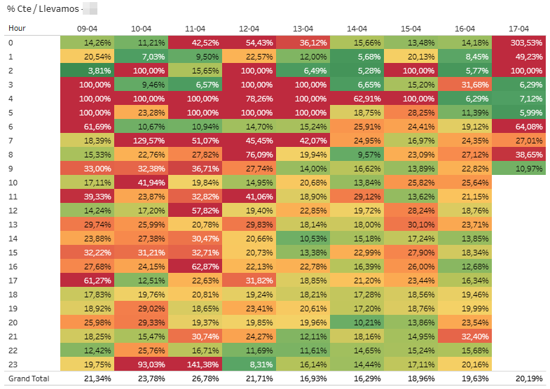 Vista individual: una tienda a fondo. Eje X: las horas del día, de 9:00 a 23:00. Eje Y: los días del periodo. Cada celda es el ratio acumulado en esa hora de ese día, mapeado a color: verde oscuro cuando es eficiente, rojo oscuro cuando estás sangrando.