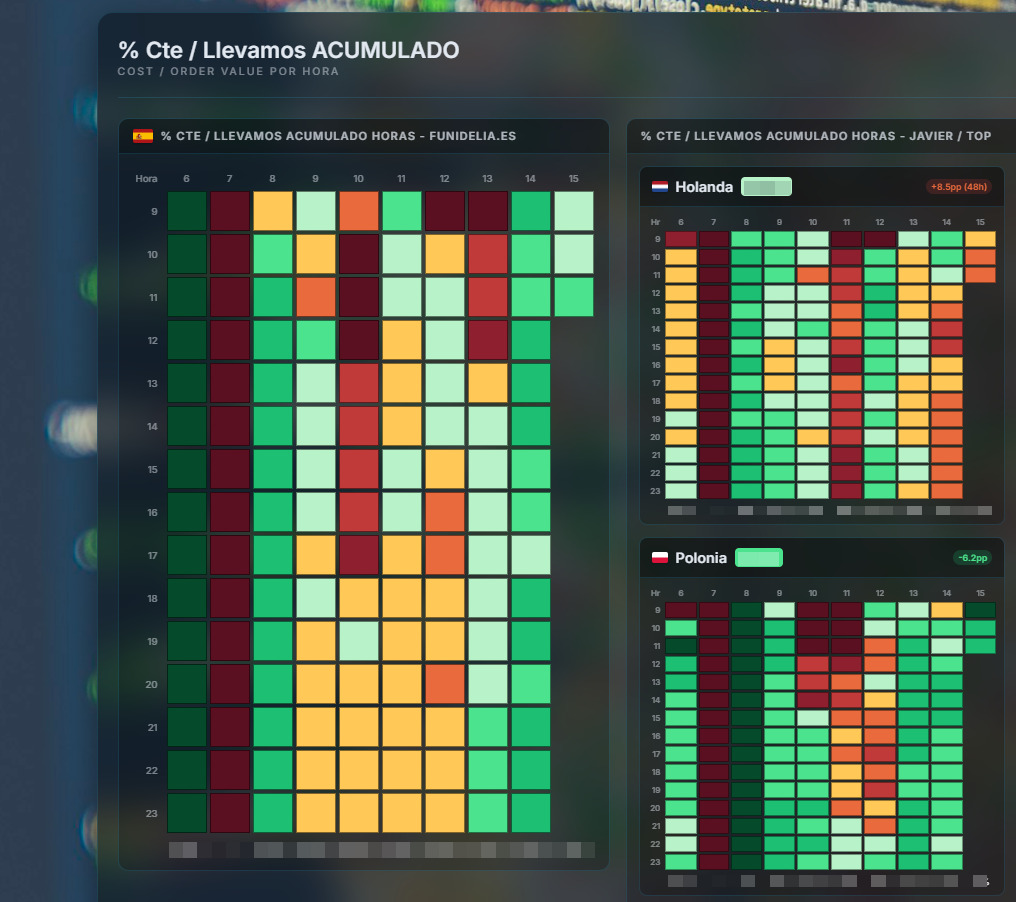 Lo que hace útil a esta métrica no es el número. Es «la curva». El coste de la última hora aislada no dice nada: si a las 14:00 el ratio iba en 0.18 y a las 18:00 marca 0.45, algo se ha roto. El algoritmo de puja salió de fase, entró un competidor, tu hora de corte ha pasado y ya no entregas cuando lo necesitan los clientes en el país en cuestión.. Por alguna razón, los pedidos pararon mientras el gasto seguía corriendo.